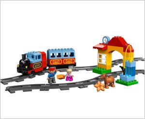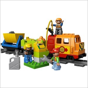 Duplo Deluxe Train SetOr you can just buy the Deluxe Train set. It’s not as cute, maybe; the train is a modern cargo train versus that passenger steam train But there’s a lot happening in this set. Cargo can be loaded and unloaded with a crane, and the track can be put together as a figure eight with a little railway bridge. This train is also compatible with all other Duplo trainsets, including the track extension pack. On the downside, it is twice the price of the simple train set.