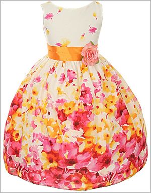 - If you’d like your little girl’s skirt to be a riot of colorful blooms one very pretty option is the Kid’s Dream Lavender Flower Print Sash Easter Dress. This is a lovely white, pink and yellow sleeveless dress, with a full double-layered skirt that should go down to below your little girl’s knee. The zipper at the back makes it easy to get on your little girl; no wrestling with a tight collar here. The bodice is white with a few small delicate, flowers flying over it, the skirt full of riotous blooms. This dress is 100% cotton, and the sash a pretty satin. You have two color options: fuchsia; bright pink and yellow blooms, or pretty lavender (purple).