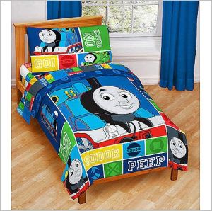 Gullane Thomas and Friends 4 Piece Toddler Bed SetThomas & Friends also has a 4 Piece Toddler Bed Set available, done in different shades of blue. The material is pretty similar; cotton/polyester blend; the pattern seems to be the major difference between those two sets. Which you prefer will depend on your own taste. This set also includes a pillowcase, fitted sheet, flat sheet, and quilted bedspread.