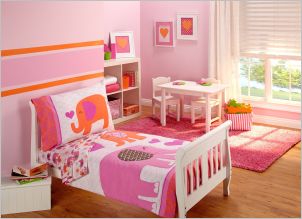 - Another extremely cute little girl’s bed set is the Elephants Walk Toddler Bed Set from Carter’s. Two big, happy, sleepy elephants walk across the light-colored quilt, and another is falling asleep on the pillowcase. Actually, the pillowcase features two elephants, one on each side; choose if you’d rather have the orange or pink elephant facing up tonight. The sheets are a white print, with lots of cute pink and orange elephants sleepily walking over them. Cute, soft, and very comfortable to sleep between; what more can you ask?