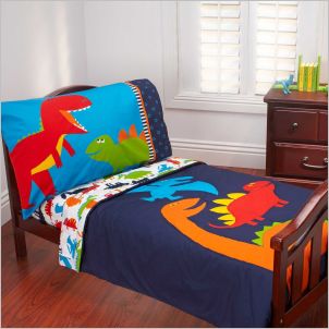 - When it was time to take a break from the road I could dress up his bed in Carter’s 4 Piece Toddler Bed Set: Prehistoric Pals. Here the dark blue comforter has three of the brightly colored big lizards on it; and the pillow features another two, one with a big, wide open mouth just ready for lunch. The white sheets have lots of colorful dinosaurs printed on them, every which way. In case your toddler cares, the dinosaurs featured are tyrannosaurus-rex, pterodactyl, stegosaurs and triceratops; drawn simply but with expression.